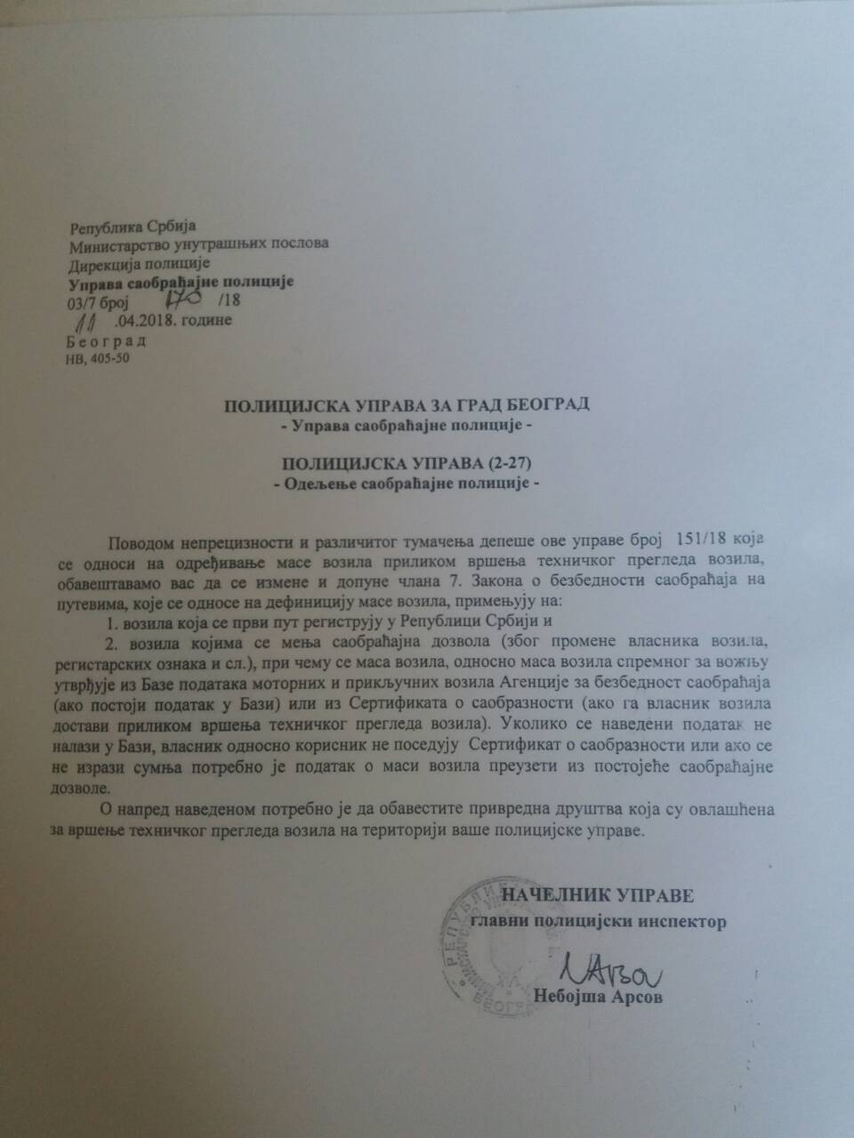 Stupanjem na snagu izmena i dopuna ZBS početkom aprila 2018 kontrolori na tehničkim pregledima su bili u velikoj dilemi u vezi sa izmenom definicije mase vozila u članu 7 koja podrazumeva za većinu vrsta vozila (uglavnom putničkih i teretnih) i masu vozača od 75 kg ("masa vozila spremnog za vožnju"). Na velikom broju tehničkih pregleda počeli su da menjaju podatke već registrovanim vozilima ispravljajući "masu vozila" u skladu sa ovom definicijom iz ZBS, tačnije dodavali su na podatak upisan u saobraćajnu dozvolu još 75 kg i na taj način prouzrokovali da vlasnici vozila plaćaju dodatne troškove novih saobraćajnih dozvola...Kako je ovo izazvalo nedoumice i negativne reakcije kod građana moralo je na neki adekvatan način da se reši pa je MUP uputio obaveštenje tehničkim pregledima kada su u obavezi da menjaju podatak o masi vozila i u kojem slučaju to da ne čine. Obaveštenje možete pogledati ovde